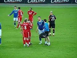 Liverpool had the first attack of the half when they were awarded a free-kick for foul on José Enrique. The subsequent free-kick was cleared by Whittingham only as far as Henderson whose shot was wide of the Cardiff goal.[35] Two minutes later Cardiff had a chance to extend their lead; Whittingham went past Agger and passed to Don Cowie, who back heeled the ball to Miller, his subsequent shot went wide of the Liverpool goal.[34] Henderson received the first yellow card of the match after his tackle on Mason was deemed to be too high.[33] Cardiff had another chance in the 56th minute; a Gunnarsson long throw was punched away by Reina, but the clearance fell to Hudson, who headed the ball into the Liverpool penalty area to Gestede, his subsequent header was blocked by the Liverpool goalkeeper.[34] Liverpool made the first substitution of the match a minute later when Henderson was replaced by Craig Bellamy.[35] Two minutes after the substitution, Liverpool equalised. Downing took a corner kick, which was headed on by Carroll to Suárez, whose header hit the post, it rebounded to Škrtel; his shot went into the Cardiff goal to level the match at 1–1.[33] Cardiff had the first chance after Liverpool's goal, but Mason's shot was saved by Reina.[33]