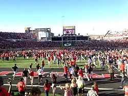 Texas Tech fans rush the field after the Red Raiders blow out the West Virginia Mountaineers at Jones AT&T Stadium in Lubbock, TX.