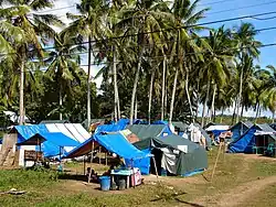 There were also threats to public health. Community health centers and hospitals were rendered useless, resulting in the use of makeshift wards outside the affected buildings. Food supply was also disrupted, with many markets unable to operate a week after the quake. Furthermore, prolonged periods of aftershocks forced the population to take residence in makeshift shelters, afraid to go inside weakened buildings, and causing psychological trauma.[37][38]