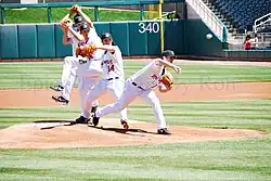 The Dodgers traveled to Phoenix to begin a four-game series against the Diamondbacks, needing to win just two of them to clinch the Western Division title. In the opener, Hyun-Jin Ryu allowed only two hits in a complete game effort; however, one of those hits was a two-run homer by Paul Goldschmidt and they lost again 2–1.[170] Matt Kemp and Hanley Ramírez returned to the Dodgers' lineup on September 17 after missing time with injuries and both reached base four times as Uribe and González homered. The Dodgers snapped the four-game losing streak with a 9–3 win.[171] They failed in their first chance to clinch the division when spot starter Stephen Fife didn't make it out of the third the next night and Ronald Belisario was pounded for five runs in relief. The Diamondbacks won 9–4.[172] The Dodgers clinched the National League West championship with a 7–6 win over the Diamondbacks on September 19. Ramírez hit two home runs and A. J. Ellis hit the game-winning homer in the eighth inning for the Dodgers' first West title since 2009. The team's 9+1⁄2-game deficit on June 21 was the largest the Dodgers had ever overcome to win a division, and they were just the fourth team in MLB history to ever accomplish that feat.[173] The next day, the Dodgers rested all the regulars in the opening of a series at the San Diego Padres. The backups could not generate any offense and the Padres won 2–0.[174] Clayton Kershaw was brilliant the next day, pitching seven shutout innings while allowing just three hits and striking out ten. Yasiel Puig and A. J. Ellis both hit two-run homers in the 4–0 victory.[175] Zack Greinke pitched five shutout innings as the Dodgers wrapped up their series with the Padres with a 1–0 win.[176] Hyun-jin Ryu allowed only one run in seven innings and Puig and Matt Kemp each hit solo homers as the Dodgers won the opener of their final road series of the season, 2–0, over the Giants.[177] Ricky Nolasco allowed six runs over 5+2⁄3 innings in his last start of the regular season, a 6–4 loss to the Giants. It was his third straight poor start.[178] The Dodgers finished up their final road series of the regular season when Ángel Pagán homered off Paco Rodriguez to give the Giants a 3–2 victory.[179]