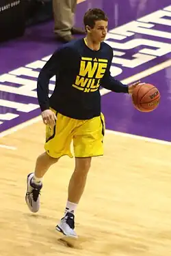Michigan lost to Purdue on January 3, by making only 4 second half field goals after taking an 8-point half time lead.[99] The team defeated Penn State on January 6 with Albrecht in the starting lineup in place of Chatman.[100][101] On January 10, the team wore throwback uniforms honoring the 1988–89 Michigan Wolverines men's basketball team that won the 1989 NCAA tournament. Michigan was down 49–40 with less than nine minutes remaining, before coming back to defeat Minnesota by a margin of 62–57.[102][103] Michigan lost to (Receiving votes/#25)[104] Ohio State on January 13.[105] On January 17 Michigan defeated Northwestern,[106] but lost LeVert for the season after he reinjured the foot that he had had surgery on the prior May.[107][108][109] In the game, Muhammad-Ali Abdur-Rahkman made his first start (in place of an ailing Albrecht) and made the game winning three-point shot.[110][111] At the time of his injury, LeVert led Michigan in scoring (14.9), rebounds (4.9), assists (3.7), steals (1.7) and minutes (35.8). Nonetheless, the team defeated Rutgers in its first game without LeVert and with Dawkins making his first start. With LeVert absent, Walton scored 10 of the team's 15 points as it rallied from a 42–37 deficit to assume a 52–44 lead with just 32.5 seconds left.[110][112] On January 24, Michigan fell to (AP #6/Coaches #5)[113] Wisconsin in overtime after Walton, who had a team-high 17 points, scored Michigan's final seven points, including a game-tying three-point shot with 1.3 seconds remaining in regulation.[114][115] The game had been the featured College GameDay game of the week.[116] On January 27 with Walton and Mark Donnal sidelined Michigan defeated Nebraska, as Irvin recorded his first career double-double, leading the team with 14 points and a career-high 12 rebounds.[117][118] Eventually, Walton missed final 12 of the season due to a toe injury.[119] Due to the backcourt injuries, Dakich burned his redshirt season.[64] Michigan finished the first half of its conference schedule with a 6–3 record.[120]