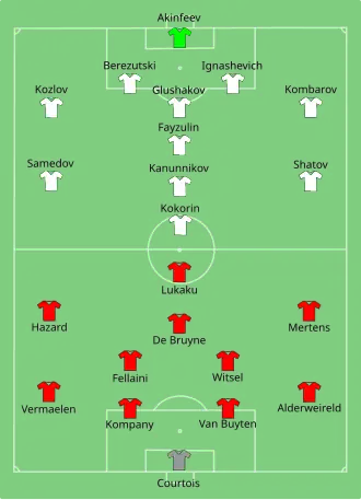 The two teams had met in eight previous matches (including matches involving the Soviet Union), including four in the FIFA World Cup (1970, group stage: Belgium 1–4 Soviet Union; 1982, second group stage: Belgium 0–1 Soviet Union; 1986, round of 16: Belgium 4–3 (aet) Soviet Union; 2002, group stage: Belgium 3–2 Russia).[8]