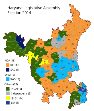 A general election was held on 15 October 2014 to elect 90 members of the Haryana Legislative Assembly. The term of previous assembly elected in 2009 was to expire on 27 October 2014. The results were announced on 19 October.[1] The BJP won the majority in the Assembly.[2][3] Manohar Lal Khattar was chosen to head the new government.