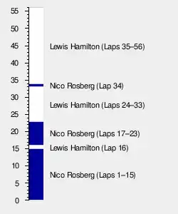 Massa kept reasonably between both Mercedes cars and was 2.4 seconds ahead of Ricciardo. Williams elected to make a pit stop for the medium compound tyres for Bottas at the end of lap 30 and Ricciardo responded by going seven-tenths of a second faster than Bottas in the final third of the lap.[40] Ricciardo made his pit stop on the following lap and emerged ahead of Bottas. He began matching Massa's pace before the latter made a problematic pit stop on lap 32:[41] his mechanics were delayed for one second in the installation of a front tyres,[40] promoting Ricciardo to third.[43] Hamilton entered the pit lane from the lead on the 33rd for his final stop and rejoined in second, behind teammate Rosberg, whom Mercedes told to go faster. Rosberg led lap 34 before making his pit stop, returning the lead to Hamilton.[42] Vettel overtook Grosjean for tenth on lap 37 and drew close to Magnussen soon after.[41] He overtook Magnussen on the outside three laps later but was unable to slow sufficiently and the latter retook ninth.[42]