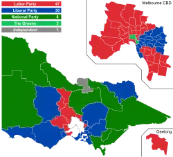 The election marked the first time since 1955 that a Victorian state government had been defeated after only one parliamentary term. Furthermore, the Nationals were reduced to a total of ten seats in the Legislative Assembly and Legislative Council, one short of official status in the legislature.[1] Following the election, both Napthine and Ryan resigned as leaders of the Liberal and National parties, respectively.