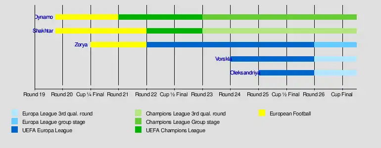 - After the 26th round, Zorya Luhansk qualified for the 2016–17 UEFA Europa League Group Stage by securing the third best league position eligible for the European competition and making the outcome of the 2016 Ukrainian Cup Final irrelevant for the European qualification. At the same time, Vorskla Poltava and FC Oleksandriya will start at the 2016-17 UEFA Europe League third qualification round.