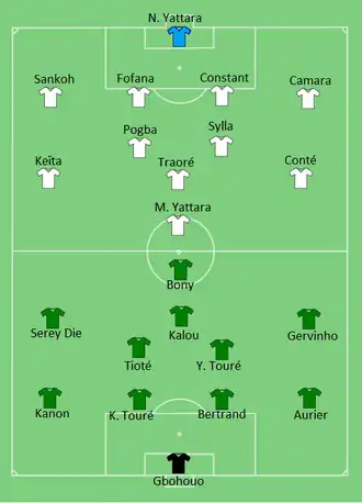 Guinea took the lead in the 36th minute when Mohamed Yattara smashed home a headed clearance from the Ivory Coast defence. Gervinho was sent off in the 58th minute for hitting Naby Keïta in the face, but the 10-men Ivory Coast equalized in the 72nd minute, as Wilfried Bony controlled the ball on his chest and passed to Seydou Doumbia to score.[5][6]
