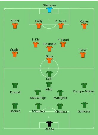 The only goal of the match was scored by Max Gradel in the 35th minute, as he stole the ball from the Cameroon defence, dribbled inside and shot home from outside the penalty area. The win sent Ivory Coast to the quarter-finals as group winners, while Cameroon were eliminated.[17][18]