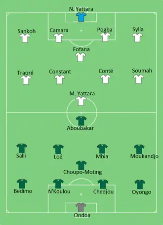 Cameroon took the lead in the 13th minute, when Benjamin Moukandjo's corner evaded everybody and hit the goalkeeper to go into the net. Guinea equalized in the 42nd minute, as Ibrahima Traoré received a pass from Issiaga Sylla, and shot home from outside the penalty area.[14][15]