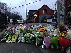 Dagbladet Information published a photo of flowers laid where the killer died.[66] Politiken reported "the perpetrator also gets flowers".[67] The Jyllands-Posten reported that at 16:30 local time the same day, a group of 30 young masked men removed the flowers.[68] The New York Times reported that the group "shouted 'Allahu akbar', or 'God is great', as they removed flowers laid in memorial".[69] The Local of Sweden reported, "One of the men told reporters that they removed the flowers because it is not a Muslim tradition to lay flowers for dead people."[70] A wire from Agence France Presse published by La Dernière Heure of Belgium read, "An elderly woman, who brought flowers but did not wish to be identified, said 'the boy didn't know what he was doing'".[71] The National Post of Canada reported, "'We've put flowers here because we must remember him,' said a young Arab man, who gave his name as Mohammed. 'He was a good guy. We don't believe he did anything wrong.'"[72]