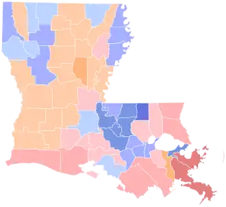 ![]() Nungesser: 20–30% 30–40% 40–50% 50–60% 60–70% 70–80% 80–90% Holden: 20–30% 30–40% 40–50% 50–60% 60–70% 70–80% 80–90% >90% Young: 20–30% 30–40% 40–50% 50–60% 60–70% 70–80% 80–90% >90% Guillory: 20–30% 30–40% 40–50% 70–80% Tie: 30–40% 40–50% 50% No votes ![]() Nungesser: 20–30% 30–40% 40–50% 50–60% 60–70% 70–80% 80–90% Holden: 20–30% 30–40% 40–50% 50–60% 60–70% 70–80% 80–90% >90% Young: 20–30% 30–40% 40–50% 50–60% 60–70% 70–80% 80–90% >90% Guillory: 20–30% 30–40% 40–50% 70–80% Tie: 30–40% 40–50% 50% No votes ![]() Nungesser: 50–60% 60–70% 70–80% 80–90% >90% Holden: 50–60% 60–70% 70–80% 80–90% >90% Tie: 50% No votes ![]() Nungesser: 50–60% 60–70% 70–80% 80–90% >90% Holden: 50–60% 60–70% 70–80% 80–90% >90% Tie: 50% No votes ![]() Nungesser: 50–60% 60–70% 70–80% 80–90% >90% Holden: 50–60% 60–70% 70–80% 80–90% >90% Tie: 50% No votes | |||||||||||||||||||||||||||||||||||||