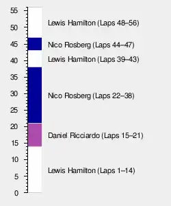 A battle for the lead developed between Hamilton and Ricciardo, until the Australian moved around Hamilton on lap 15. With the grip of the intermediate tyres deteriorating, there were many overtaking manoeuvres on track. Rosberg unsuccessfully tried to overtake teammate Hamilton for second on lap 16, while Verstappen took sixth place from Vettel one lap later, only to run wide and lose the position again. On lap 18, Rosberg moved ahead of Hamilton, who was the first of the front runners to change tyres at the end of the lap, going for a dry compound. The other frontrunners followed suit over the next couple of laps. Following the pit stops, Ricciardo led from Rosberg, Kvyat and Hamilton.[32][34] The two Mercedes drivers moved ahead of their respective Red Bull rivals on laps 22 and 23, while Vettel, now in fifth, closed on the leading quartet. On lap 24, he reached Kvyat and overtook him for fourth, while Rosberg extended his lead to Ricciardo to nine seconds by lap 25. Hamilton took second place from Ricciardo one lap later. At the same time, Kimi Räikkönen was forced to retire.[32] So had Massa on lap 24, suffering the same problem that had forced his teammate to stop.[36]