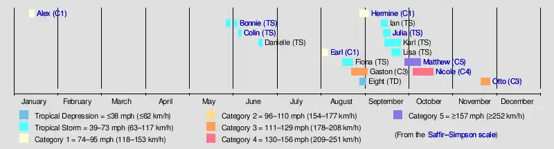 The year opened up with an anomalous storm in January: Hurricane Alex, the first system of such intensity to develop in January since 1938.[22] Activity picked up at the end of May into June, with three consecutive tropical storms: Bonnie, Colin, and Danielle. The latter two became the earliest third- and fourth-named storms on record respectively.[23][24][25] July saw no storm development for the first time in four years, however.[26] August saw the formation of five tropical cyclones, including Earl, Fiona, Gaston, Eight, and Hermine. A Category 1 hurricane, Earl wrought tremendous damage in Belize and Mexico. With 81 lives lost in Mexico during the passage of Earl, it was the deadliest Atlantic hurricane in the country since 2005.[27] Gaston became the season's first major hurricane on August 28, attaining peak winds of 120 mph (195 km/h) over the central Atlantic.[28] On September 1, Hermine struck the Florida Peninsula as a Category 1 hurricane, ending an 11-year drought of hurricane landfalls in the state, which began after Hurricane Wilma in October 2005.[29]