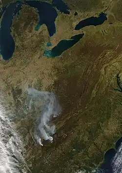 ![]() Satellite photo taken on November 7, 2016, showing wildfires burning in the U.S. states of Georgia, North Carolina, Tennessee, and Kentucky. | |