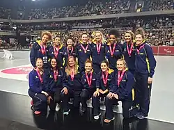 ![]() Team Bath celebrate with their 2016 Netball Superleague bronze medals | |