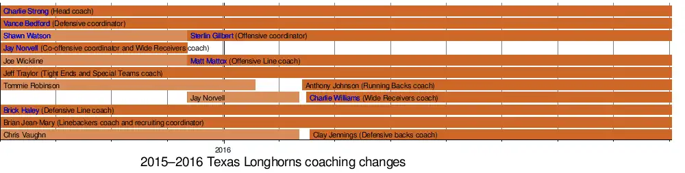 - ^ "Coaching Staff". Texas Longhorns Athletics. Austin, Texas: TexasSports.com. Archived from the original on December 15, 2015. Retrieved December 16, 2015.