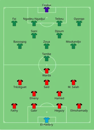 Egypt took the lead on 22 minutes.[33] Elneny received the ball from Salah, who had cut in from the right, and shot right-footed high to the roof of the net past Ondoa on his left side.[34] Adolphe Teikeu was replaced by Nicolas Nkoulou after 31 minutes, after sustaining a groin injury. Shortly afterwards, Cameroon almost scored when El Hadary failed to claim a cross, but the Egyptian defence was able to clear.[31] Having failed to create many attacking opportunities for most of the half, Cameroon exerted some pressure in the final ten minutes before half time, but they remained unable to score. The half-time score was 1–0 to Egypt.[33] Cameroon had more possession than Egypt in the first half, but the Egyptians had created more scoring opportunities.[35]