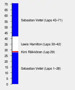 Setting the pace through most of the race, Vettel won the Grand Prix, followed by Bottas and Räikkönen. Including Hamilton, the top four finished within the space of 5.5 seconds, with the two Red Bulls more than 30 seconds behind. The following three positions also carried a race-long battle to the finish line, finishing within 1 second of each other. Initially overtaking on lap 5 (as the safety car was pulling into pitlane), Massa held off Alonso who remained close throughout the race.[7] Sergio Pérez also caught up to these two racers to cross the finish line barely behind Alonso.