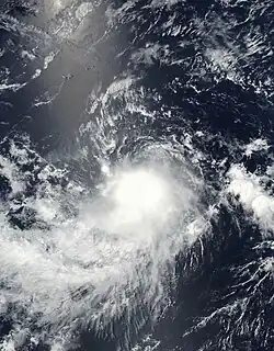 On July 28, the NHC noted the possibility of an area of low pressure well south of Mexico developing over subsequent days.[89] An area of disorganized showers and thunderstorms associated with a tropical wave materialized three days later, but little change occurred thereafter.[90] Early on August 3, a surface circulation formed in association with concentrating convection,[91] and this process led to the formation of a tropical depression by 06:00 UTC the next day.[92] The newly formed cyclone did not intensify after designation, and its low- and mid-level circulations separated by over 265 mi (425 km) on August 5 due strong easterly wind shear.[93] Falling short of the tropical storm criteria, the short-lived depression was declared a remnant low at 18:00 UTC that day.[92] The lingering vortex slowed its northwestward motion and executed a counter-clockwise loop, before dissipating completely 205 miles (330 km) southwest of the Baja California Peninsula on August 8.[92]