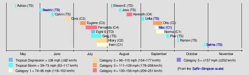 Although hurricane season in the eastern Pacific does not officially begin until May 15, and on June 1 in the central Pacific,[6] activity began several days prior with the formation of a tropical depression in the eastern region on May 9. This was the earliest formation of a tropical cyclone on record in the eastern Pacific basin proper,[7] until broken by Tropical Depression One-E in 2020. When it intensified into Tropical Storm Adrian a few hours later, the system became the earliest named storm on record in the region,[8] a record that stood until broken by Tropical Storm Andres in 2021.[9] Near normal activity occurred in June, with Tropical Storm Calvin formed on June 11, and Hurricane Dora on June 25.[10] For the third year in a row, July featured above average activity, with the fifth highest ACE value for that month on record.[11] This total was due to long-lived hurricanes Eugene, Fernanda, Hilary, and Irwin. August saw significantly less activity, with only three storms forming in the month; however it featured Hurricane Kenneth, the third major hurricane of the season. September featured four storms, including Hurricane Otis, which became the fourth major hurricane of the season. Only two storms formed after October 1, Ramon and Selma. Both did not attain hurricane status, though Selma became the first and last storm to make landfall in El Salvador. No systems were active in November for the first time since the 2010 season. The Accumulated Cyclone Energy index for the 2017 Pacific hurricane season as calculated by Colorado State University using data from the National Hurricane Center was approximately 100.7 units,[nb 5][12] about 20 percent near average.
