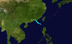 Sustained winds of 51.3 knots (95.0 km/h; 59.0 mph) and a minimum pressure of 990.3 hPa (29.24 inHg) were recorded in Hong Kong as the eye passed nearby.[37] Across Guangdong Province, 32 homes were destroyed, 122,000 people reported property damage, and 13,000 hectares of crops flooded. Total economic losses in South China were counted to be CN¥600 million (US$88.3 million).[39]