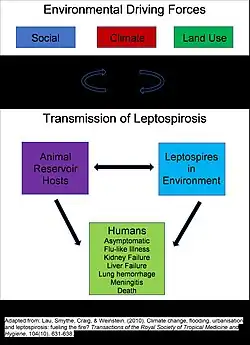 - ^ a b c d e f g h i Lau CL, Smythe LD, Craig SB, Weinstein P (October 2010). "Climate change, flooding, urbanisation and leptospirosis: fuelling the fire?". Transactions of the Royal Society of Tropical Medicine and Hygiene. 104 (10): 631–8. doi:10.1016/j.trstmh.2010.07.002. PMID 20813388.