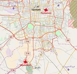 The 2017 Tehran attacks were a series of two simultaneous terrorist attacks that occurred on 7 June 2017 that were carried out by five terrorists belonging to the Islamic State of Iraq and the Levant (ISIL) against the Iranian Parliament building and the Mausoleum of Ruhollah Khomeini, both in Tehran, Iran, leaving 17 civilians dead and 43 wounded.[4][5][6] The shootings were the first terrorist attacks in Tehran in more than a decade,[7] and the first major terror attack in the country since the 2010 Zahedan bombings.[8]