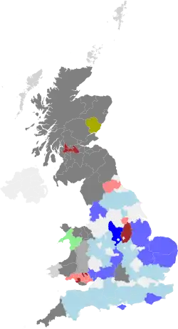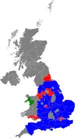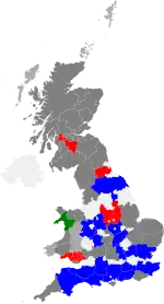 There were also 687 independent councillors and 4 Mebyon Kernow councillors. The remaining 217 seats were held by residents' associations and minor parties.[19] A by-election for the parliamentary constituency of Manchester Gorton (caused by the death of Sir Gerald Kaufman, the sitting MP) was due to be held on the same day as the local election, but the by-election was cancelled after the general election was called for the following month.[17]