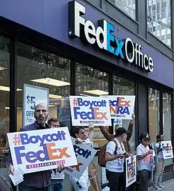 Pressure on FedEx to drop NRA discounts of up to 26 percent had been going on for nearly a year before the Florida shooting.[26][42] After several companies cut ties with the NRA, calls to boycott FedEx arose on social media under the hashtag #BoycottFedEx.[43] In a statement, FedEx affirmed that while it does not fully agree with the NRA on issues of gun policy, it will continue its business relationship with the organization.[44][45][46] Due to a drop in NRA-related volume that made the organization ineligible for discounts, the NRA was dropped from the program on October 30, 2018.[47]