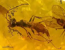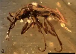 - ^ Qi Zhang; Alexandr P. Rasnitsyn; Bo Wang; Haichun Zhang (2018). "Hymenoptera (wasps, bees and ants) in mid-Cretaceous Burmese amber: A review of the fauna". Proceedings of the Geologists' Association. 129 (6): 736. Bibcode:2018PrGA..129..736Z. doi:10.1016/j.pgeola.2018.06.004. S2CID 134358795.