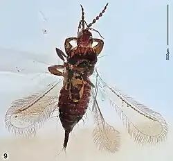 - ^ a b Manfred R. Ulitzka (2018). "A first survey of Cretaceous thrips from Burmese amber including the establishment of a new family of Tubulifera (Insecta: Thysanoptera)". Zootaxa. 4486 (4): 548–558. doi:10.11646/zootaxa.4486.4.8. PMID 30313740.