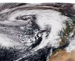 The precursor to Storm Bernardo was first noted as a deep low over north-eastern Canada on 7 November.[56] After considerably weakening and crossing the Atlantic without any notable impacts, the system was named Bernardo by the State Meteorological Agency of Spain (AEMET) on 9 November as it was approaching the Iberian Peninsula from the Bay of Biscay.[14] Bernardo crossed northern Spain and emerged into the Mediterranean Sea, affecting the Balearic Islands on 10 November with wind gusts of up to 111 km/h (69 mph; 60 kn) recorded in the Alfabia Mountains along the north-west coast of Mallorca.[57] On 11 November, Bernardo strengthened to its peak intensity of 996 mbar (29.4 inHg)[58] and formed an eye-like feature, leading several media outlets to report that the storm had medicane-like characteristics.[59] However, AEMET did not confirm that the storm had reached medicane status.[57]