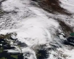 After losing its brief eye-like feature, Bernardo followed the coast of Algeria, remaining closely offshore as it moved eastwards across the Mediterranean before stalling over southern Italy for two days.[60][61][62] Bernardo then accelerated to the north-east as a weak frontal boundary, moving over the Baltic states on 14 November[63] and into northern Russia on 15 November.[64] After briefly reintensifying and then weakening once more, Bernardo was last noted as a weak low over Siberia on 18 November.[65]