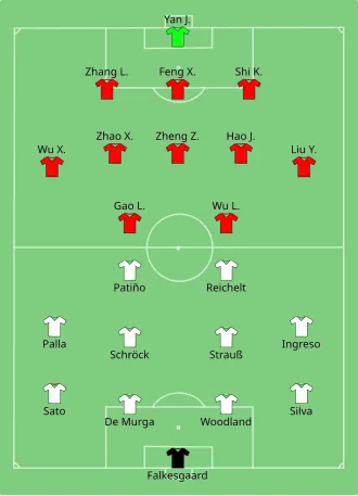 The Philippines threatened to break the deadlock in the 23rd minute when Patrick Reichelt and John-Patrick Strauß combined to set-up Javier Patiño whose goalbound effort was blocked by defender Feng Xiaoting. However, after Wu Xi had flashed a header narrowly wide, China went ahead on 40 minutes, Wu Lei received Hao Junmin's pass and finished from 12 yards past Michael Falkesgaard. In the final moments of the first half, Chinese custodian Yan Junling made a fine save to deny Kevin Ingreso and maintain his side's slender advantage. After the break, Wu Lei's angled volley forced Falkesgaard into a save, before he bagged his second of the game with a finish from Hao's 66th minute free-kick. Falkesgaard then pulled off another stop to deny Wu Lei once again, only for Yu Dabao to add a third in the 80th minute when he headed home from a corner just 19 seconds after coming on as a substitute.[12]