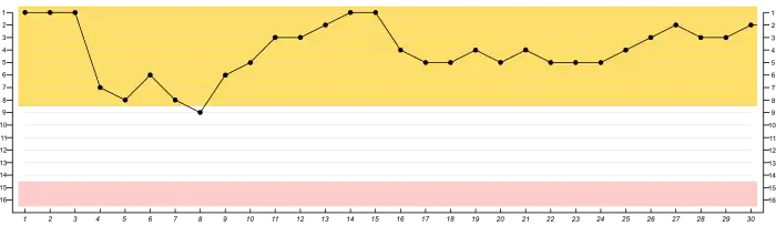 | 14 | Técnico Universitario | 30 | 8 | 5 | 17 | 40 | 60 | −20 | 29 | |