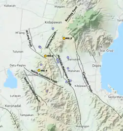 Mindanao lies across the complex convergent boundary between the Sunda plate and the Philippine Sea plate.[7] Part of the oblique convergence between these plates is taken up by subduction along the Cotabato Trench. The strike-slip component of the convergence is accommodated partly by the Philippine fault system and partly by the Cotabato Fault System, a network of mainly NW-SE trending sinistral (left-lateral) strike-slip faults that form the boundary between the Cotabato Arc and the Central Mindanao Volcanic Belt.[8] In the area of the October 2019 earthquakes series, the individual faults include the NW-SE trending South Columbio Fault, North Columbio Fault, M'Lang Fault, Makilala–Malungon Fault and Tangbulan Fault, and the SW-NE trending Makilala Fault and Balabag Fault.[9]