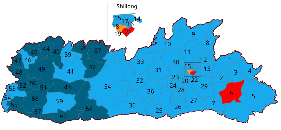 | 1 | Shillong | BJP | Sanbor Shullai | INC | Vincent Pala | UDP | Jemino Mawthoh | |||