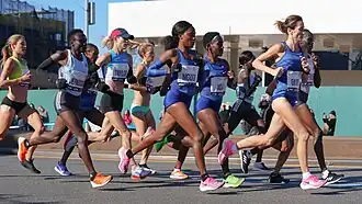In the women's race Linden broke away from the leading pack and had built up a 15-second gap by 8 miles (13 km) which extended to 31 seconds by mile 11, but she was later caught by a pack of four before the halfway mark. American Sara Hall dropped out with a stomach illness after 18 miles (29 km).[3][15] At 20 miles (32 km) into the race, Keitany and Jepkosgei were in the lead together,[8] but 3 miles (4.8 km) later, Jepkosgei began to pull away and had put a four-second gap between the two.[3] The lead further increased to 16 seconds by mile 25 and she eventually finished in a time of 2:22:38, 54 seconds ahead of Keitany who finished second.[3] Ruti Aga finished third in a time of 2:25:51.[15] Jepkosgei's time is the second fastest on the course, behind the 2003 performance by Margaret Okayo. She was also the youngest winner, at the age of 25, since Okayo won in 2001.[3] Sinead Diver, at 42-years-old, was the oldest woman to finish in the top five since Priscilla Welch won in 1987.[16] Jepkosgei, in addition to the $100,000 of prize money, also earned $45,000 for finishing in under 2:23:00.[15] Linden won the prize for fastest American, finishing sixth in 2:26:26.[15]