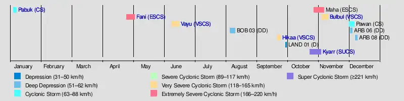 The season's first named storm, Pabuk, entered the basin on January 4, becoming the earliest-forming cyclonic storm of the North Indian Ocean on record. The second cyclone of the season, Cyclone Fani, at the time was the strongest tropical cyclone in the Bay of Bengal by 3-minute maximum sustained wind speed until it got tied with Cyclone Mocha of 2023, and minimum barometric pressure since the 1999 Odisha cyclone, while being equal in terms of maximum 3-minute sustained wind speed to 2007's Sidr and 2013's Phailin. Further activity occurred in October, and in the latter part of that month, the first and only super cyclonic storm of the 2010s, Kyarr, formed.