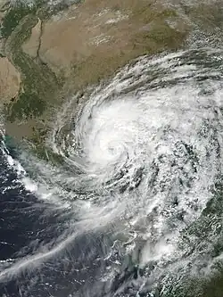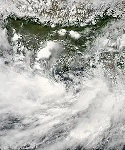 On September 28, a low pressure area formed on the adjoining areas of Saurashtra and Kutch in the state of Gujarat. The low pressure area later concentrated into a depression and moved close to Kandla at 12:00 UTC, next day. It moved east-northeastwards, towards eastern Rajasthan maintained its intensity and it developed a ragged eye until on October 1, it weakened into a low pressure area.[34]