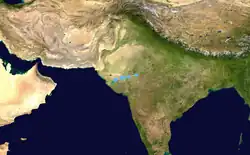 The scope of this article is limited to the Indian Ocean in the Northern Hemisphere, east of the Horn of Africa and west of the Malay Peninsula. There are two main seas in the North Indian Ocean — the Arabian Sea to the west of the Indian subcontinent, abbreviated ARB by the India Meteorological Department (IMD); and the Bay of Bengal to the east, abbreviated BOB by the IMD. The official Regional Specialized Meteorological Centre in this basin is the India Meteorological Department (IMD), while the Joint Typhoon Warning Center (JTWC) and the National Meteorological Center of CMA (NMC) unofficially release full advisories. On average, three to four cyclonic storms form in this basin every season.[1][2]