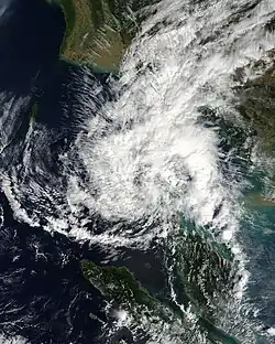 Pabuk originated in a low pressure area which formed in the South China Sea on December 28, which later became a depression on December 31. On January 1 at 06:00 UTC, it became a tropical storm with JMA naming it "Pabuk". It maintained its intensity until making landfall over the Pak Phanang District of Thailand on January 4 at 05:40 UTC. On the morning of January 5, it entered the basin, and the India Meteorological Department (IMD) began giving advisories to the system. As it entered the basin, it was designated as "Cyclonic Storm Pabuk" by the IMD. Pabuk became a deep depression at 06:00 UTC the next day, because of high wind shear and a weak MJO. It was further downgraded to a depression at 00:00 UTC on January 7, because of similar unfavorable conditions. The next day, it weakened into a well-marked low pressure area.[5]