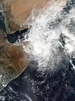 On December 2, a depression formed over the southwestern Arabian Sea, east of Somalia. Due to being in a favorable environment for development, the depression strengthened into a cyclonic storm on December 4, earning the name Pawan.[41] The system continued north, slowly strengthening, before turning west the following day,[42] Pawan struggled to maintain its structure due to being in high wind shear, but continued to move west towards Somalia. Pawan's convection would briefly dissipate due to the wind shear, but soon regenerated. Pawan would make landfall in the Puntland region of Somalia, just south of Eyl, as a cyclonic storm late on December 6. Pawan would bring heavy rain and mudslides to parts of Somalia, before degenerating into a well-marked low-pressure area on December 7.[43]