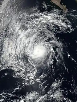 The tropical wave that spawned Cosme was succeeded a week later by another. It entered the East Pacific on July 8 but remained disorganized for several days while tracking west. The wave gave way to an area of low pressure on July 12, which then organized into a tropical depression only six hours later. The depression was located over very warm sea surface temperatures but under the influence of moderate wind shear, preventing organization. By July 12, persistent upper-level winds began to shear away the cyclone's convection. It degenerated to a remnant low at 00:00 UTC on July 14 while located south-southwest of Baja California Sur. The low produced intermittent bursts of convection as it moved west-northwest but ultimately dissipated early on July 15.[17]