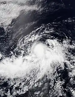 Early on September 4, the NHC began to track a quickly-developing area of low pressure about 1,100 mi (1,800 km) east-southeast of the Big Island of Hawaii.[25] Just a few hours later, following a sudden increase in convection, the system organized into Tropical Depression Twelve-E and moved into the Central Pacific basin.[26] It slowly intensified and eventually reached tropical storm status, whereupon it was named Akoni.[27] The system struggled to organize because of high wind shear and quickly degenerated into a remnant low on September 6.[28]