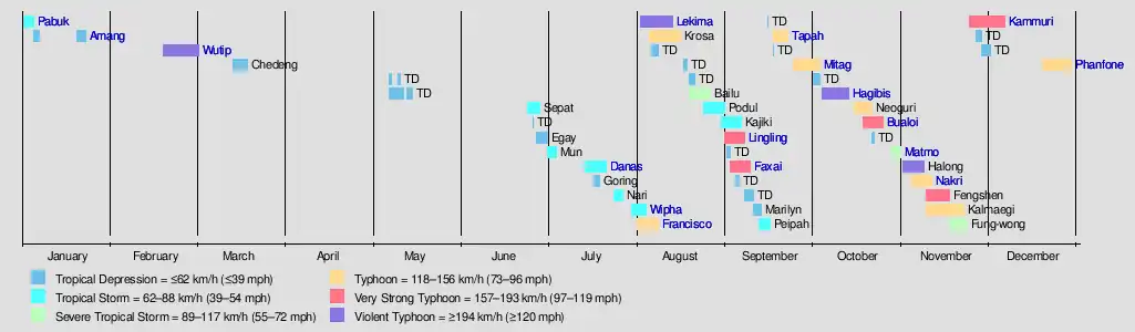 In July, four named storms developed and affected land: Mun, which affected South China, Danas and Nari, which affected mainland Japan, and Wipha which also affected South China. None of the storms, however, reached typhoon intensity, which is very rare for the month of July. By August, tropical activity began to increase with the development of three simultaneous typhoons. Typhoon Francisco affected Japan and the Korean Peninsula. Typhoon Lekima reached Category 4-equivalent super typhoon intensity east of Taiwan and made landfall in Zhejiang of eastern China. Lekima brought total damages of $9.28 billion, making it the fifth costliest typhoon and the costliest typhoon in China.[10] Typhoon Krosa formed as a Category 3 typhoon and made landfall in Japan as a severe tropical storm. Tropical Storms Bailu and Podul impacted Taiwan and the Philippines respectively as well as southern China but caused minimal damage.