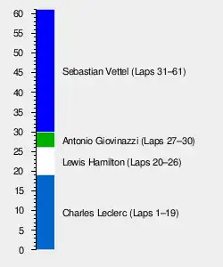 Lewis Hamilton, who was yet to stop, inherited the lead of the race. Valtteri Bottas made his pit stop at the end of lap 22, emerging behind Verstappen and ahead of Alexander Albon, maintaining his net position. Hamilton was left out on ageing soft-compound tyres until the end of lap 26, in the hope that the Ferrari drivers, at the time running in sixth and seventh, would be slowed down by the midfield cars ahead. This plan did not work, and Hamilton emerged from the pits not only behind both Ferrari drivers, but also almost six seconds behind Verstappen. Hamilton did come out ahead of his teammate Bottas, who was instructed to slow down after his pit stop to ensure Hamilton would leave the pit lane ahead of him. Due to the slow pace of the lead cars in previous laps, they emerged behind the midfield cars of Antonio Giovinazzi, Pierre Gasly, Ricciardo and Lance Stroll. Vettel and Leclerc began to make their way through this group, with Vettel cementing his net lead by clearing the cars quicker than his teammate. Giovinazzi held the lead of the race for four laps until he was overtaken by Vettel on lap 31. This marked the first time a team other than Mercedes, Ferrari or Red Bull had led a race lap since Bottas led for Williams at the 2015 British Grand Prix and the first time Alfa Romeo had done so since Andrea de Cesaris led the 1983 Belgian Grand Prix.