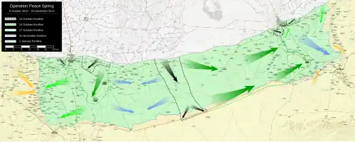 • Turkish Armed Forces, Syrian National Army and their allies capture an area of 4,820 square kilometres (1,860 sq mi),[16] with 600 settlements,[17] including Ras al-Ayn, Tell Abyad, Manajir, Suluk, Mabrouka and cut the M4 highway[18][19]