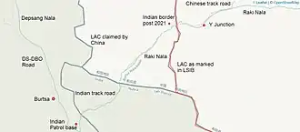 India–China tension in the Depsang area started months before the May 2020 standoff.[216] Chinese presence, 18 km (11 mi) inside the Indian perception of the LAC, near the Y-junction or Bottleneck on Burtsa Nala valley,[n] was reported by Indian media on 25 June 2020. The reports described movement of troops, heavy vehicles and military equipment. The Chinese claim lines are 5 km further west of bottleneck.[217] Indian Patrol Points (PP) 10, 11, 11A, 12 have been blocked by PLA movement and construction at the Y-junction since March–April 2020.[218][219] Intelligence inputs on 31 August 2020 put the Chinese control of territory within the India's perception of the LAC at about 900 square kilometres (350 sq mi).[132][220]