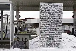 On May 26, the day after George Floyd's murder, an occupation protest emerged at the intersection of East 38th Street and Chicago Avenue in Minneapolis, where Floyd was murdered.[26][27] Protesters turned the area into a makeshift memorial and erected barricades to keep automobile traffic out, and police officers largely avoided the area in the following months. Thousands of visitors protested and grieved at the site, which was adorned with public art installments and described as like a "shrine".[28] When Minneapolis city officials attempted to negotiate reopening the intersection in August 2020, protesters demanded that the city meet a list of 24 demands before removing cement barricades around it.[29]